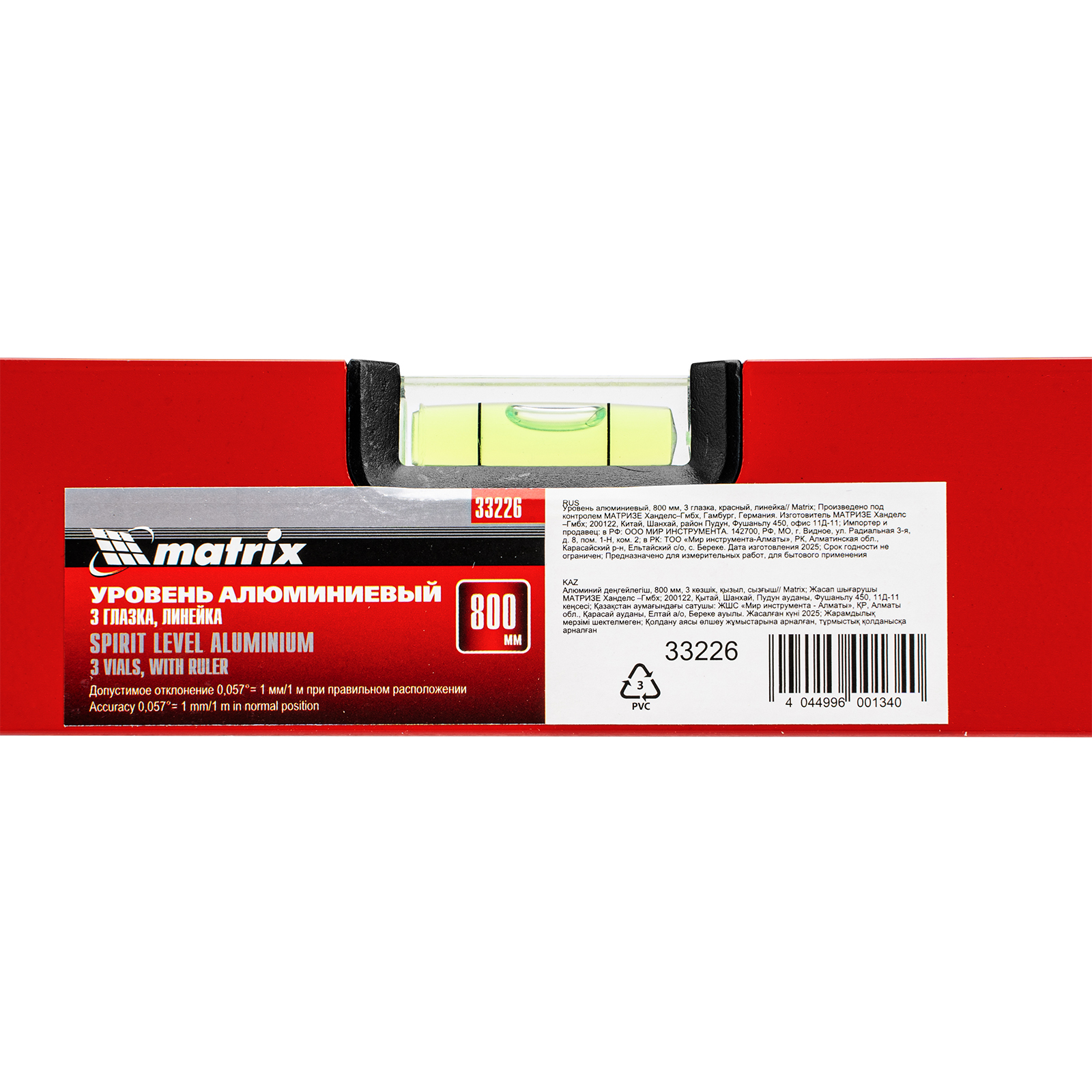 Уровень алюминиевый, 800 мм, 3 глазка, красный, линейка Matrix
