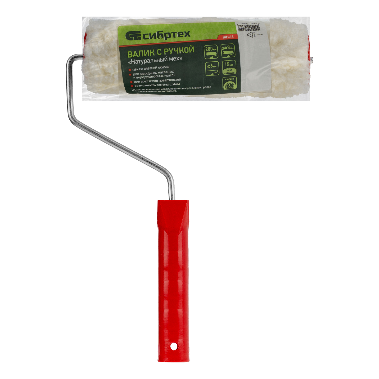 Валик в сборе Сибртех «Натуральный мех» 80163 в сборе с ручкой 6 мм, роликом 200 х 48 мм (крепление шплинтом), применяется при окрашивании фасадов зданий, стен, потолков и т.д. С его помощью можно работать с алкидными, масляными и водно-дисперсионными составами.