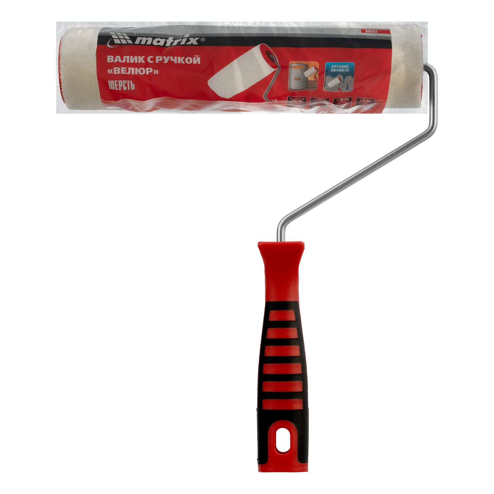 Валик Matrix «ВЕЛЮР» 80663 шириной 250 мм и диаметром 48 мм, с двухкомпонентной ручкой, бюгелем 6 мм, ворсом 4 мм из шерсти и полиакрила, позволяет наносить материал тонким слоем, поэтому оптимален для работы с лаками. Благодаря коротковорсовой шубке является идеальным помощником во время финишной отделки полов и гладкой древесины. Полиакрил в составе шубки повышает формостойкость и устойчивость валика к воздействию агрессивных веществ, что позволяет использовать его со всеми типами ЛКМ.