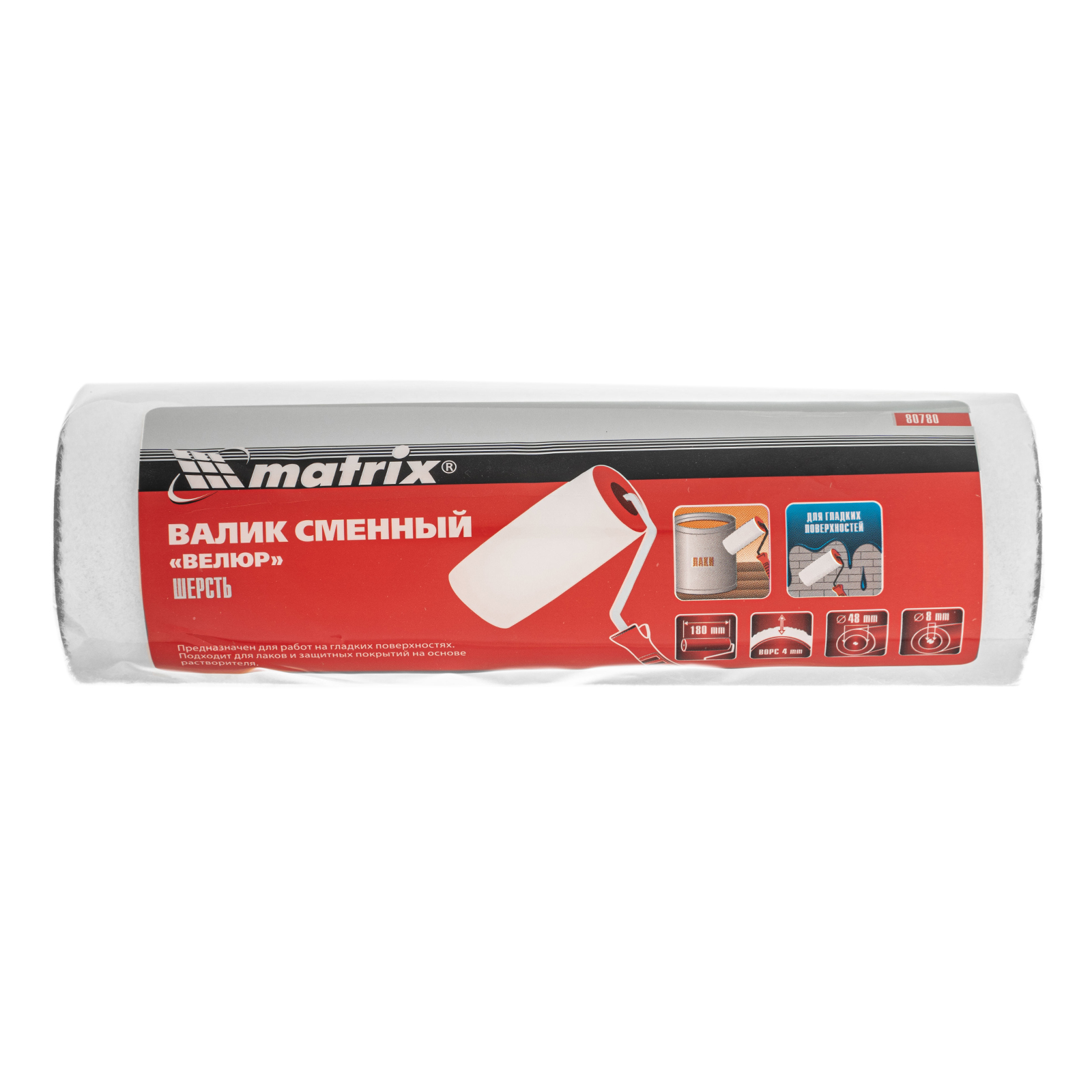 Сменный валик Matrix «ВЕЛЮР» 80780 с ворсом 4 мм из шерсти и полиакрила, диаметром 48 мм, шириной 180 мм, под ручку 8 мм, подходит для финишной окраски поверхностей, т.к. наносит ЛКМ максимально тонким слоем. Рекомендован для работ с лаками, в том числе содержащими агрессивные химические вещества. За счет короткого ворса валик оптимален для гладкофактурных поверхностей: полов и отполированной древесины.