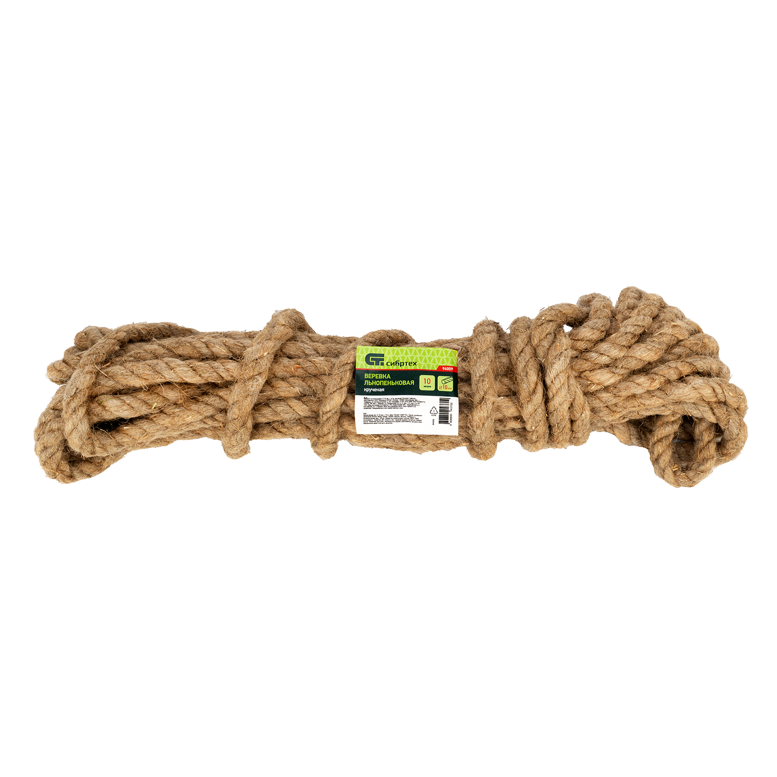 Льнопеньковая крученая веревка Сибртех 94009 диаметром 10 мм и длиной 10 м крепко связывает и закрепляет различные предметы и грузы. Применяется в быту, сельском хозяйстве, торговле, промышленности и строительстве.