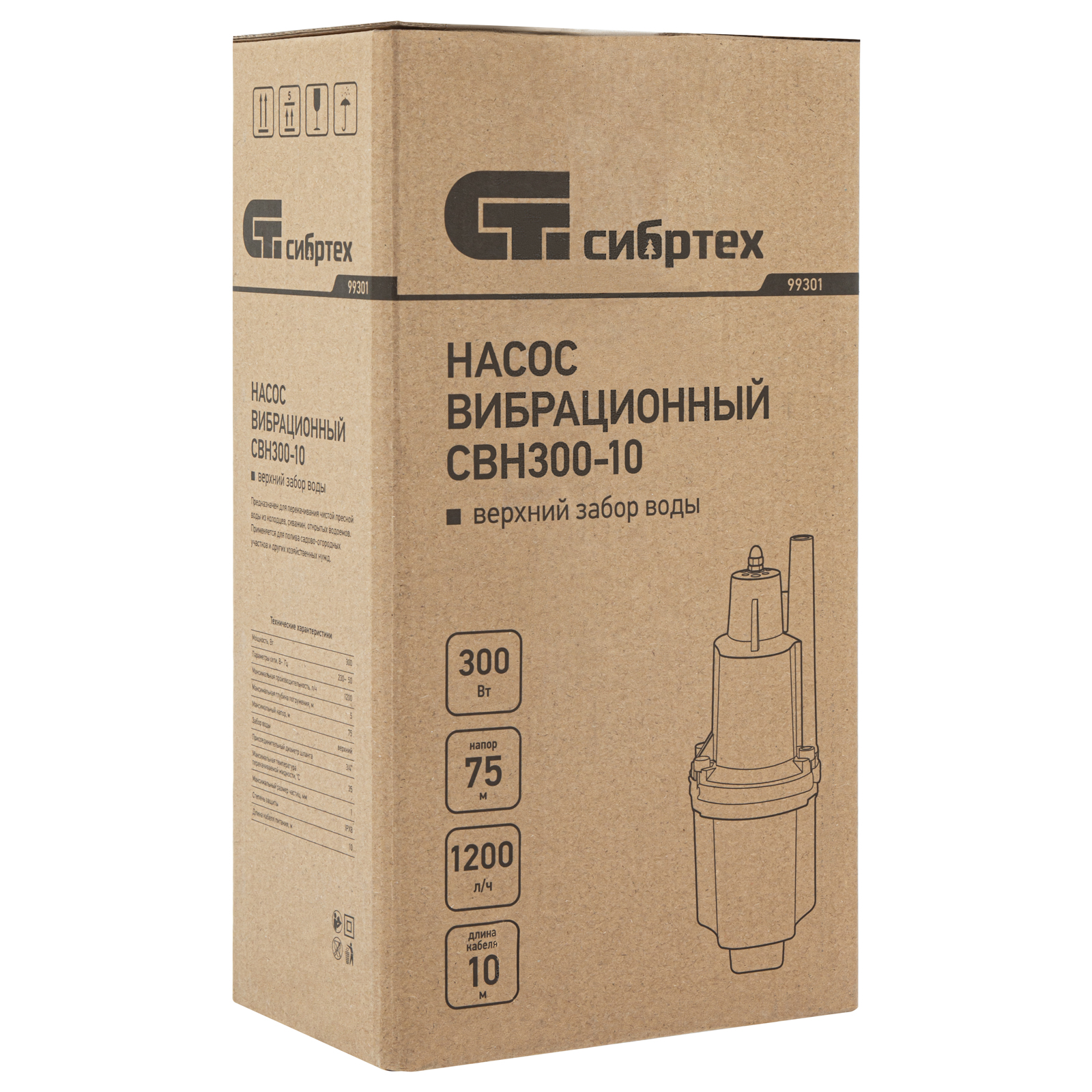 Вибрационный насос СВН300-10, верхний забор, 300 Вт, напор 75 м, 1200 л/ч, кабель 10 м Сибртех, 1200 л/ч