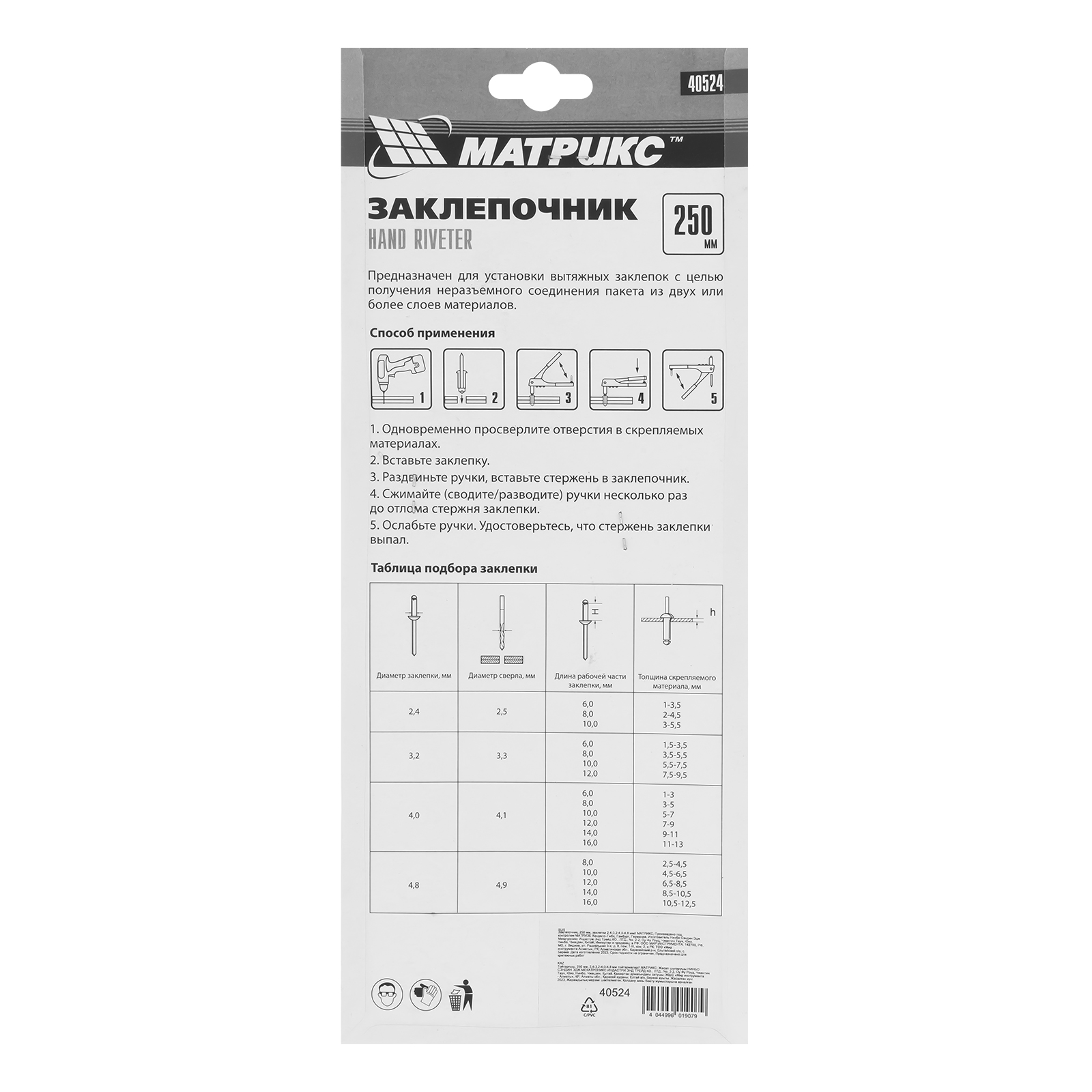 Размер заклепок, мм
